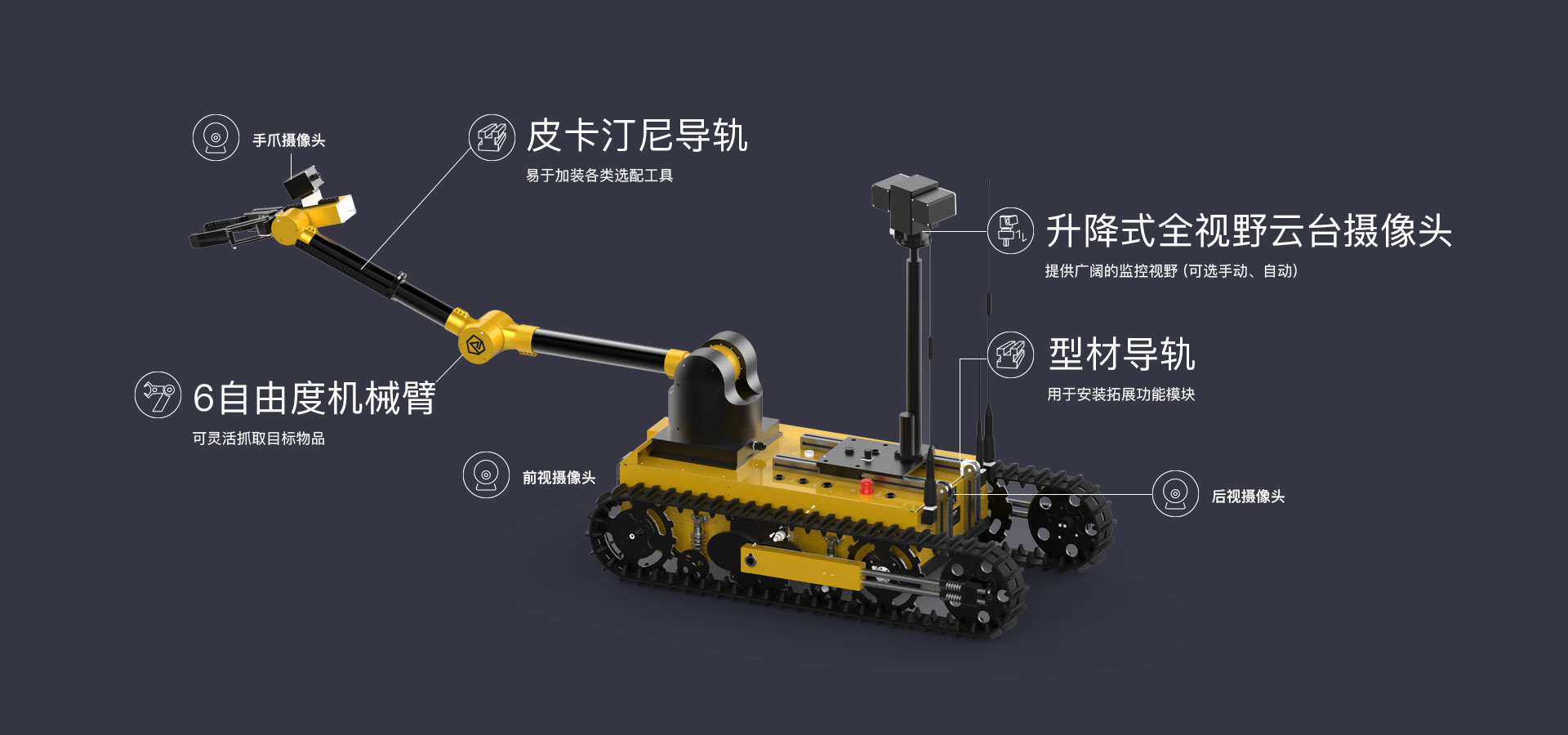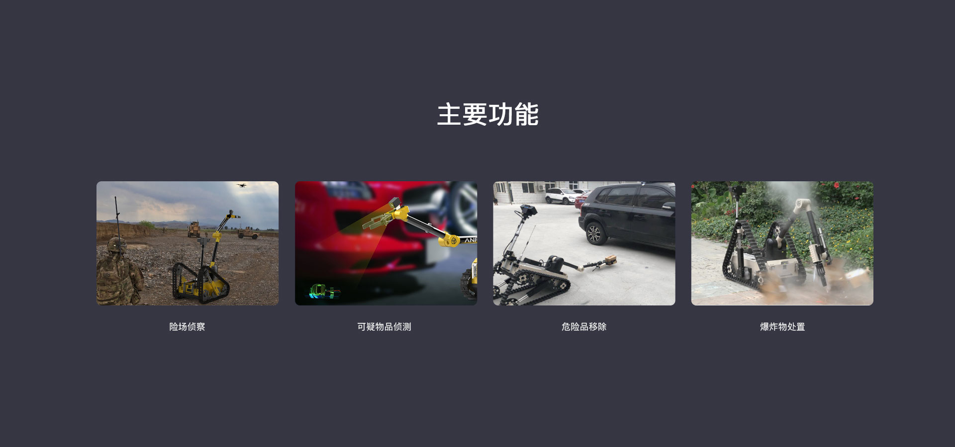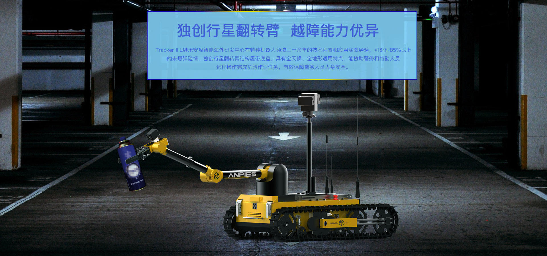 主要(yào)用(yòng)于危險物(wù)品抓取、轉移、銷毀等作(zuò)業(yè),完成排爆除險、特警防爆、危險品處置等用(yòng)λ途的(de)專用(yòng)移動機(jī)器(qì)人(rén)産品,可(kě)以完成危險性高(gāo)、随機(jī)性大(dà)<、現(xiàn)場(chǎng)情況複雜(zá)多(duō)變的(de)任務,協助警務和(hé)特勤人(rén)員(yuán)遠(yuǎn)程操作(zuò)完成危險作(zuò)業(yè)任£務,有(yǒu)效保障警務人(rén)員(yuán)人(rén)身(shēn)安全。采用(yòng)獨創行(xíng)星翻轉臂結構履帶式底盤,可(kě)自(zì)​由改變機(jī)體(tǐ)作(zuò)業(yè)的(de)角度及重心,能(néng)夠攀爬樓梯、跨越溝渠,可(kě)适應沙地(dì)、瓦礫、草(cǎo)地(dì)等 多(duō)種複雜(zá)地(dì)形。