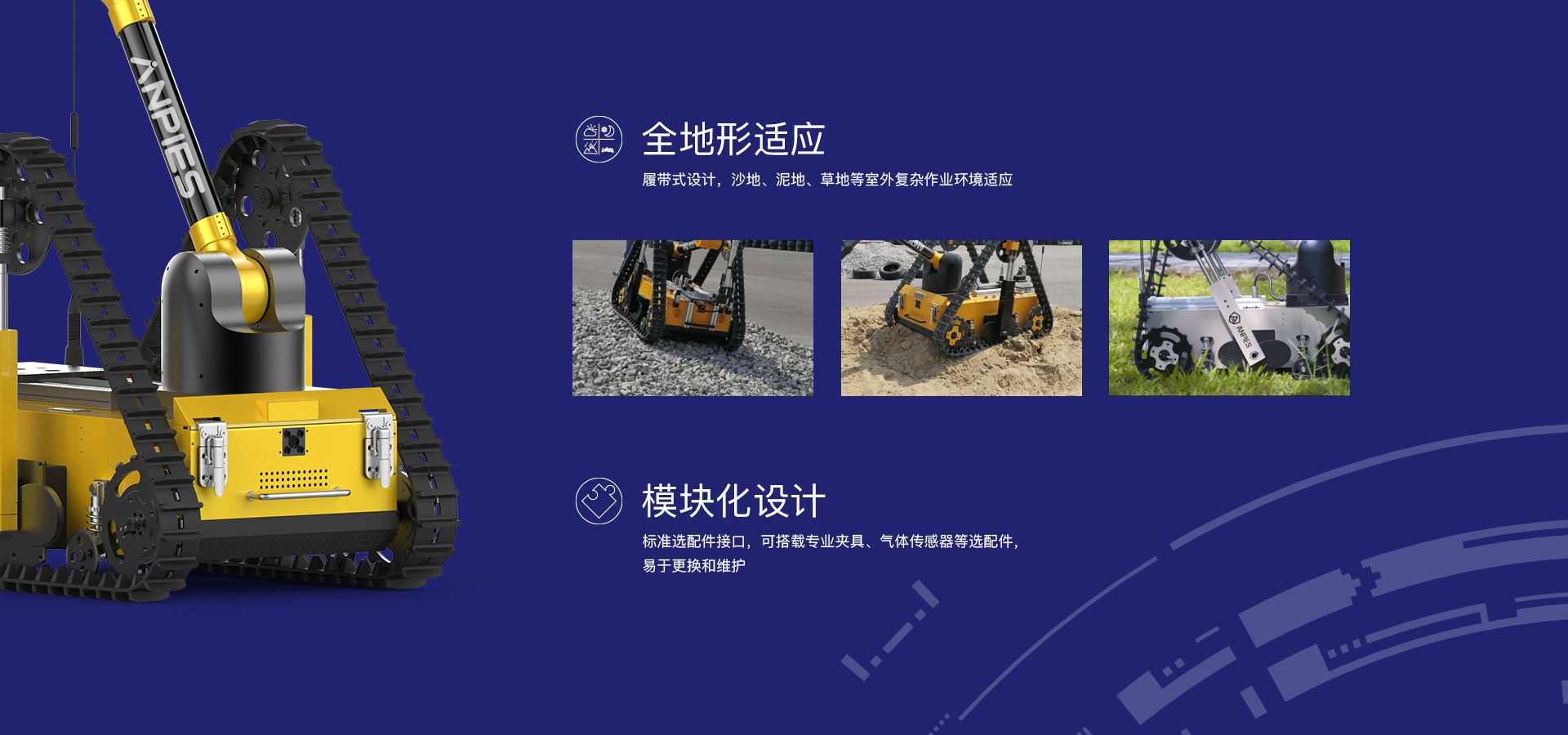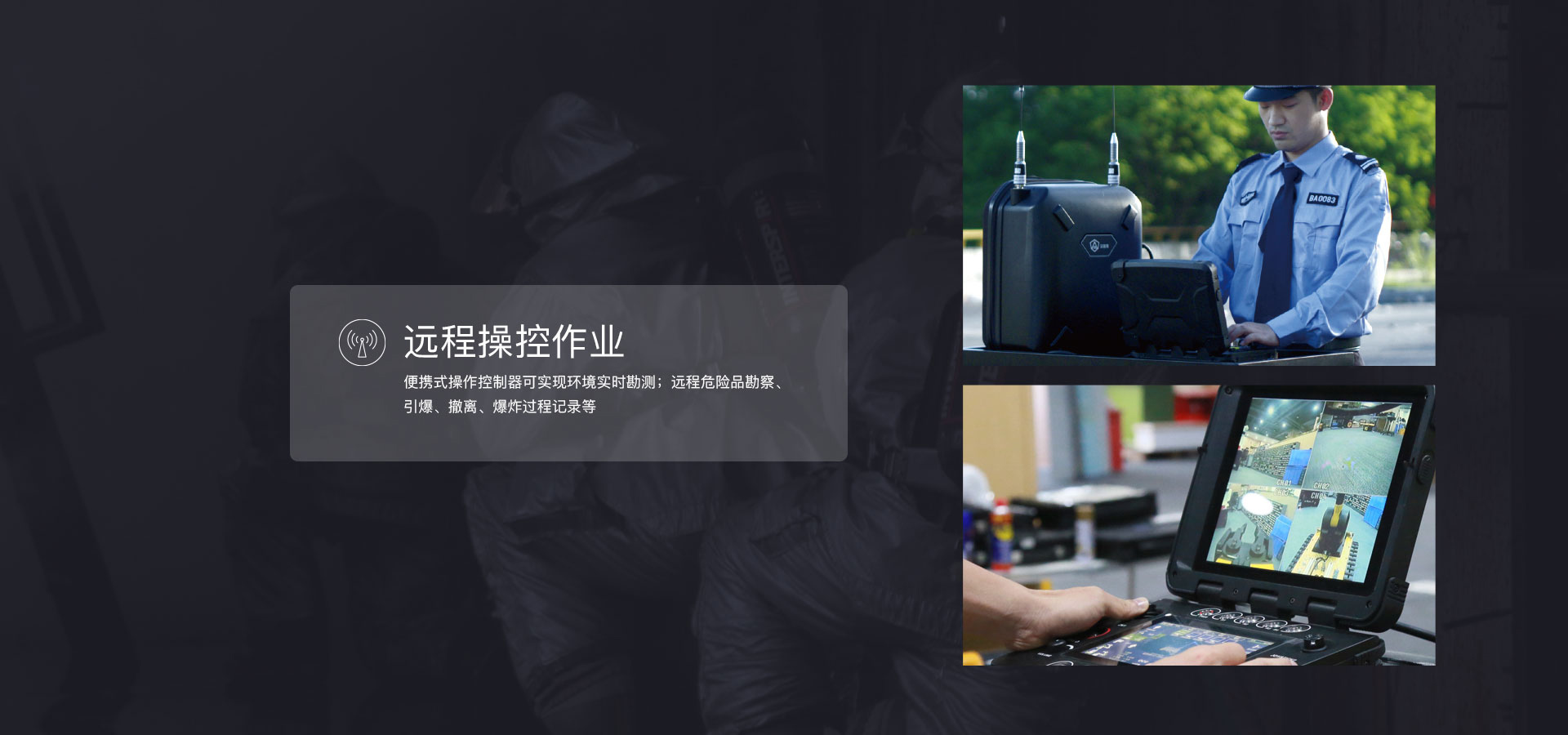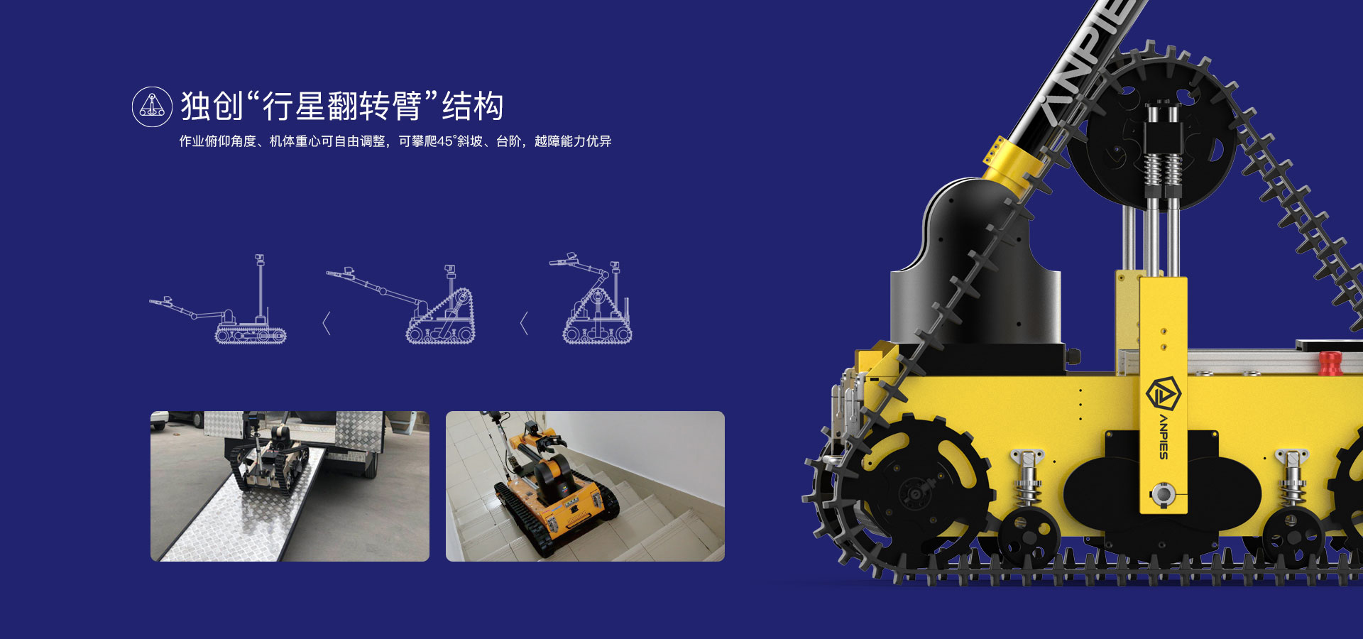 主要(yào)用(yòng)于危險物(wù)品抓取、轉移、銷毀等作(zuò)業(yè),完成排爆除險、特警防爆、危險品處置等用(yòng)λ途的(de)專用(yòng)移動機(jī)器(qì)人(rén)産品,可(kě)以完成危險性高(gāo)、随機(jī)性大(dà)<、現(xiàn)場(chǎng)情況複雜(zá)多(duō)變的(de)任務,協助警務和(hé)特勤人(rén)員(yuán)遠(yuǎn)程操作(zuò)完成危險作(zuò)業(yè)任£務,有(yǒu)效保障警務人(rén)員(yuán)人(rén)身(shēn)安全。采用(yòng)獨創行(xíng)星翻轉臂結構履帶式底盤,可(kě)自(zì)​由改變機(jī)體(tǐ)作(zuò)業(yè)的(de)角度及重心,能(néng)夠攀爬樓梯、跨越溝渠,可(kě)适應沙地(dì)、瓦礫、草(cǎo)地(dì)等 多(duō)種複雜(zá)地(dì)形。