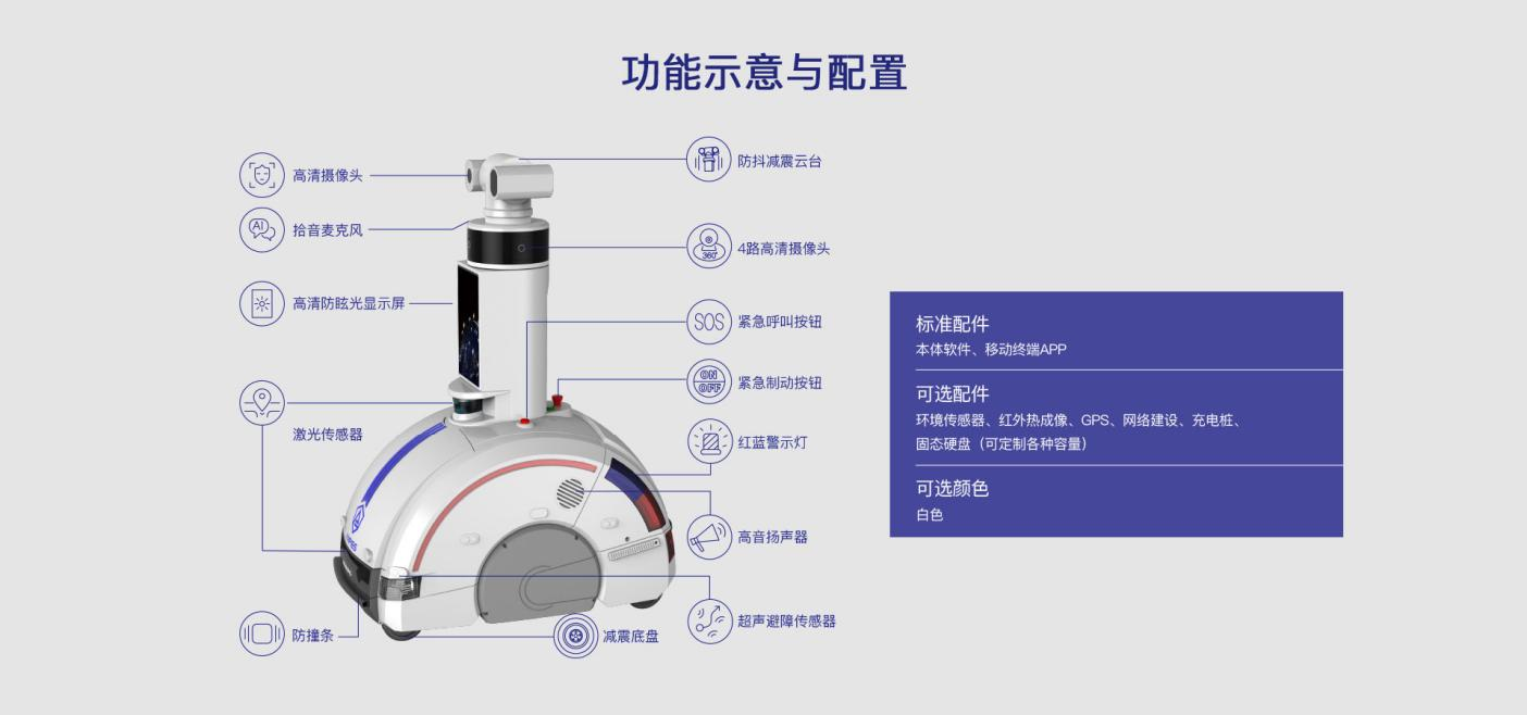 安防巡邏機(jī)器(qì)人(rén)具備自(zì)主巡邏,自(zì)動避障、定點語音(yīn)播報(bào)、人β(rén)臉識别、全方位視(shì)頻(pín)監控,一(yī)鍵SOS報(bào)警、人(rén)臉識别、環境監測、語音(y'īn)對(duì)講等多(duō)種功能(néng)的(de)安防機(jī)器(qì)人(rén)系列産品滿足智慧城(chéng)市<(shì)、居民(mín)社區(qū)、商業(yè)廣場(chǎng)、工(gōng)業(yè)園區(qū)、邊境口岸等場(chǎng)所安防需求。 (1)24小(xiǎo)時(shí↑)移動執勤:可(kě)在重點區(qū)域自(zì)主巡邏、定點執勤,突破傳統安防被動監控、監控點固定等問(wèn)題,為(wèi)事(shì)件(jiàn)處置提供依據,提高(gāo)社會(h≈uì)見(jiàn)警率,提升民(mín)衆安全感 (2)實時(shí)全景視(shì)頻(pín)監控:360°環視(shì€)相(xiàng)機(jī)與可(kě)見(jiàn)光(guāng)夜視(shì)雲台,24小(xiǎo)時(shí)全景視(shì)頻(pín)監控,視(shì)頻(pín)→數(shù)據傳輸至後台,可(kě)實時(shí)分(fēn)析與檢測,及時(shí)預警潛在危險 (3)機(jī)動快(kuài)速的(d↑e)移動布控:針對(duì)重大(dà)安保活動突發性、快(kuài)速性、移動性特點,基于4G/5G通(tōng)訊和(hé)指₩揮平台,可(kě)實現(xiàn)靈活部署、快(kuài)速布控,遠(yuǎn)程執法